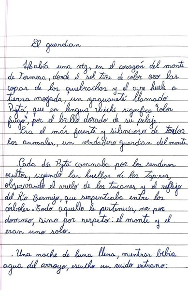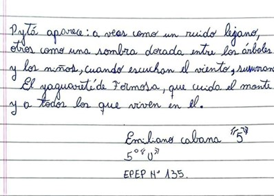 En la categoría cuentos, resultó ganador Emiliano Cabana, de 5º grado de la E.P.E.P. N.º 135 “Intendente Venancio Gómez”, de Estanislao del Campo, un territorio donde la historia reciente refleja los desafíos de la convivencia con el yaguareté y donde la escuela cumple un rol central para pensar nuevas formas de relación con la fauna nativa.